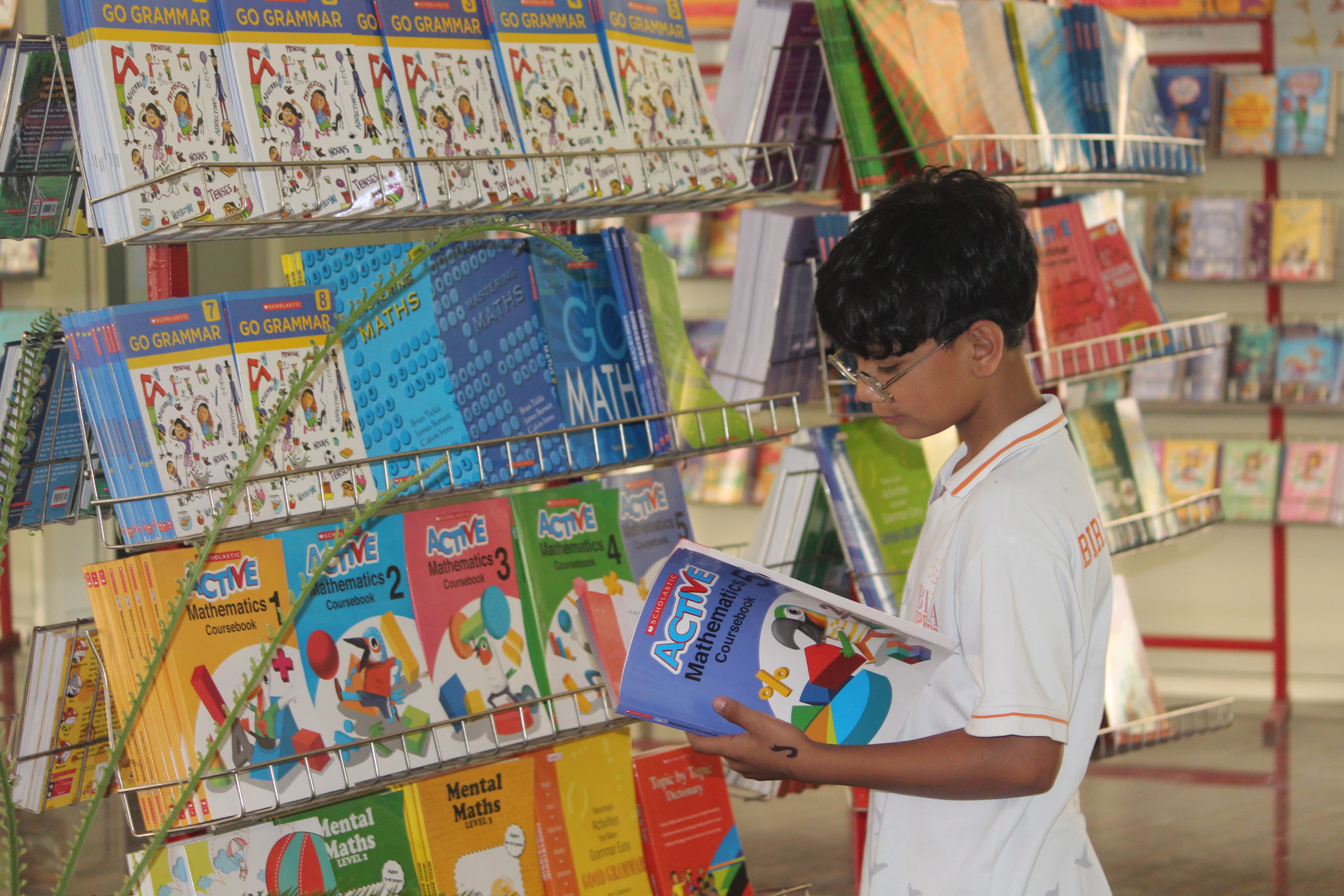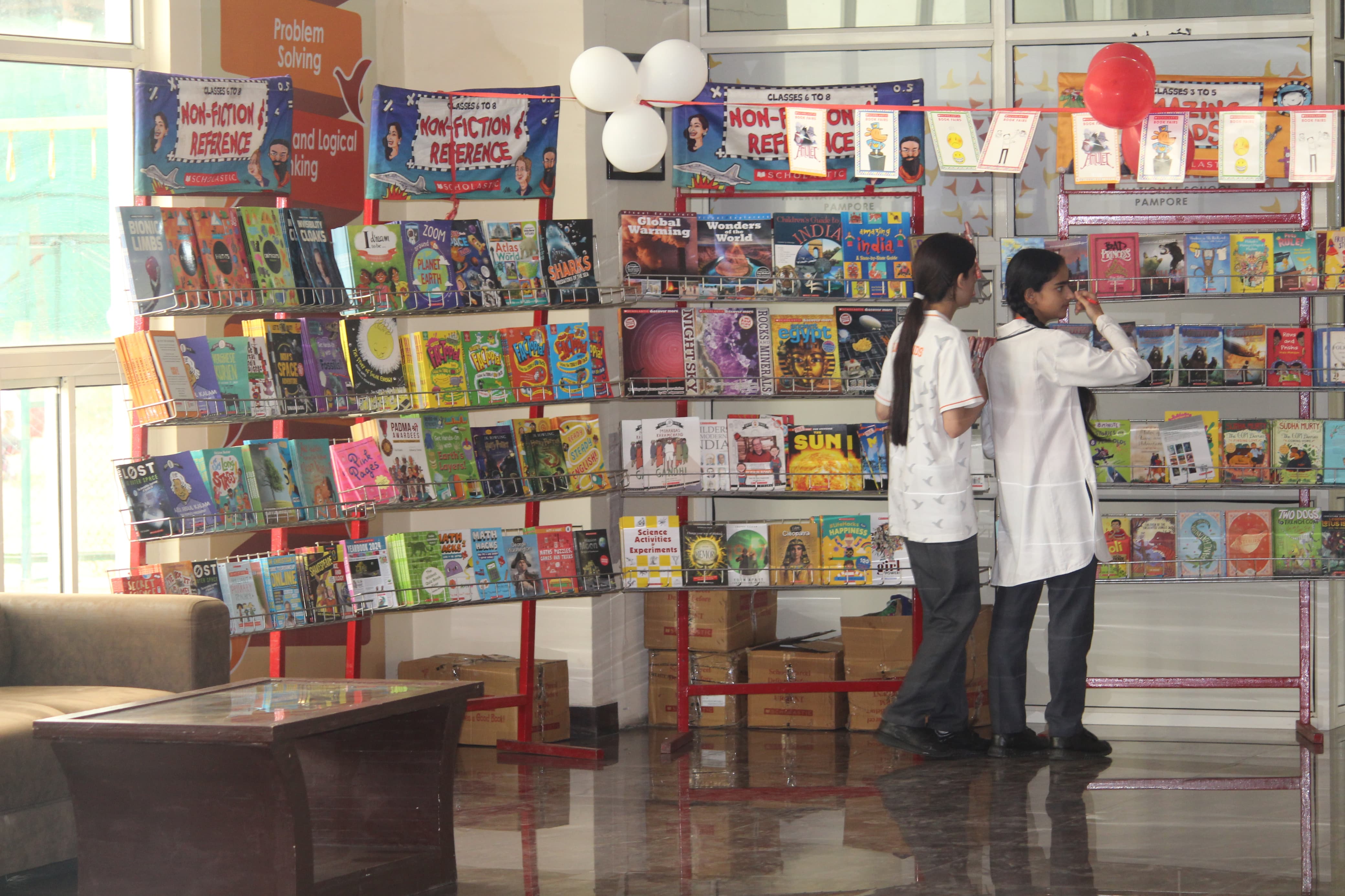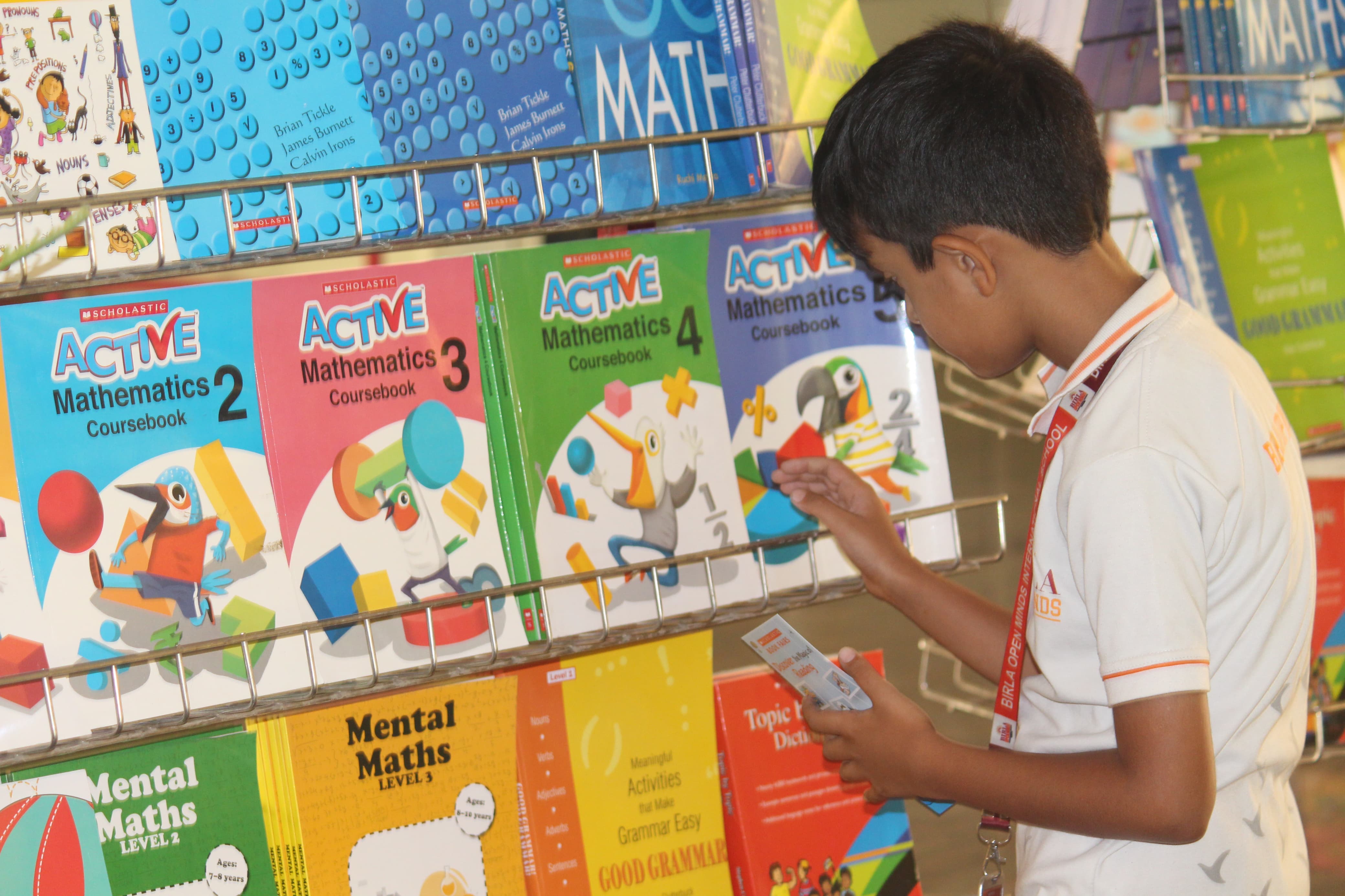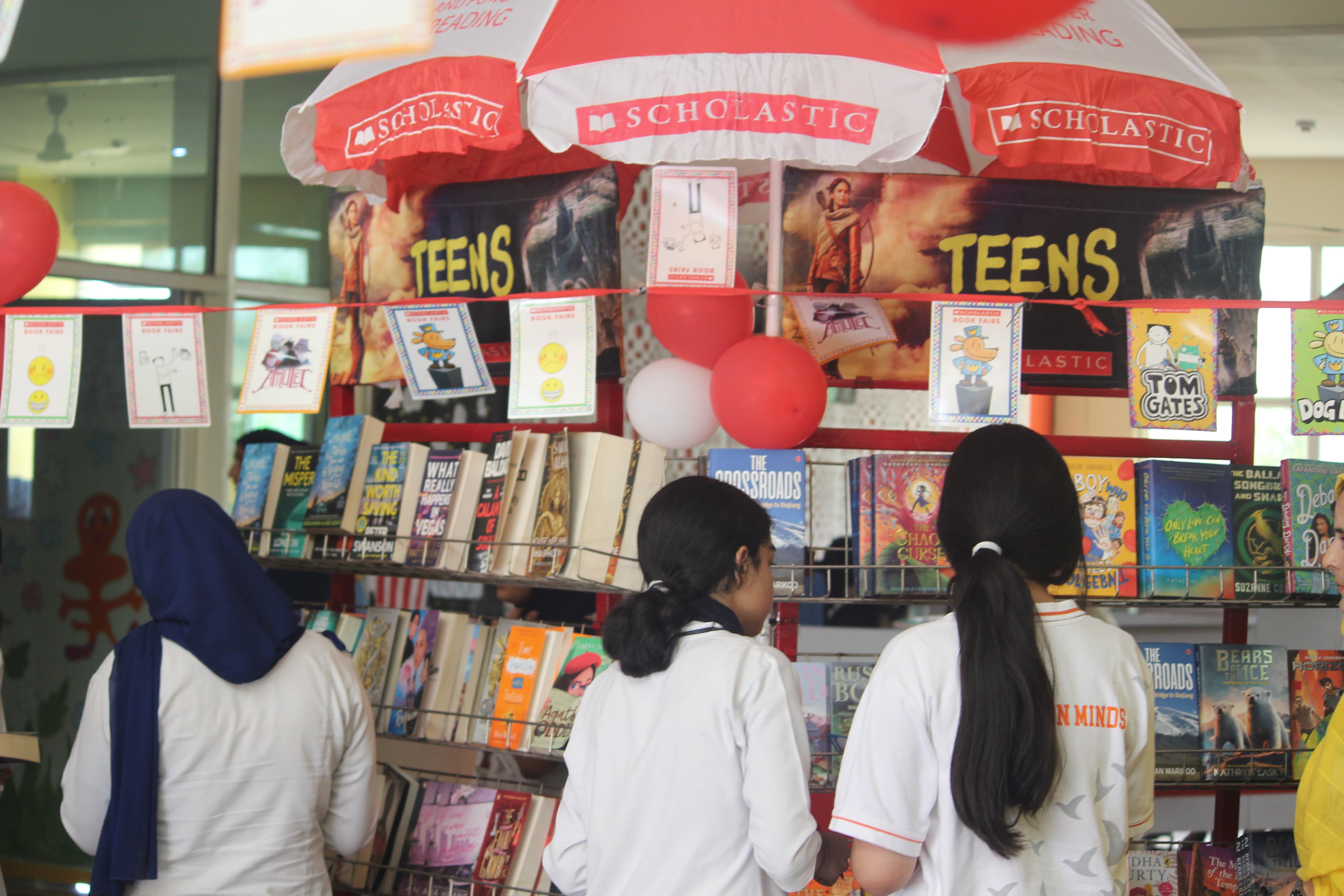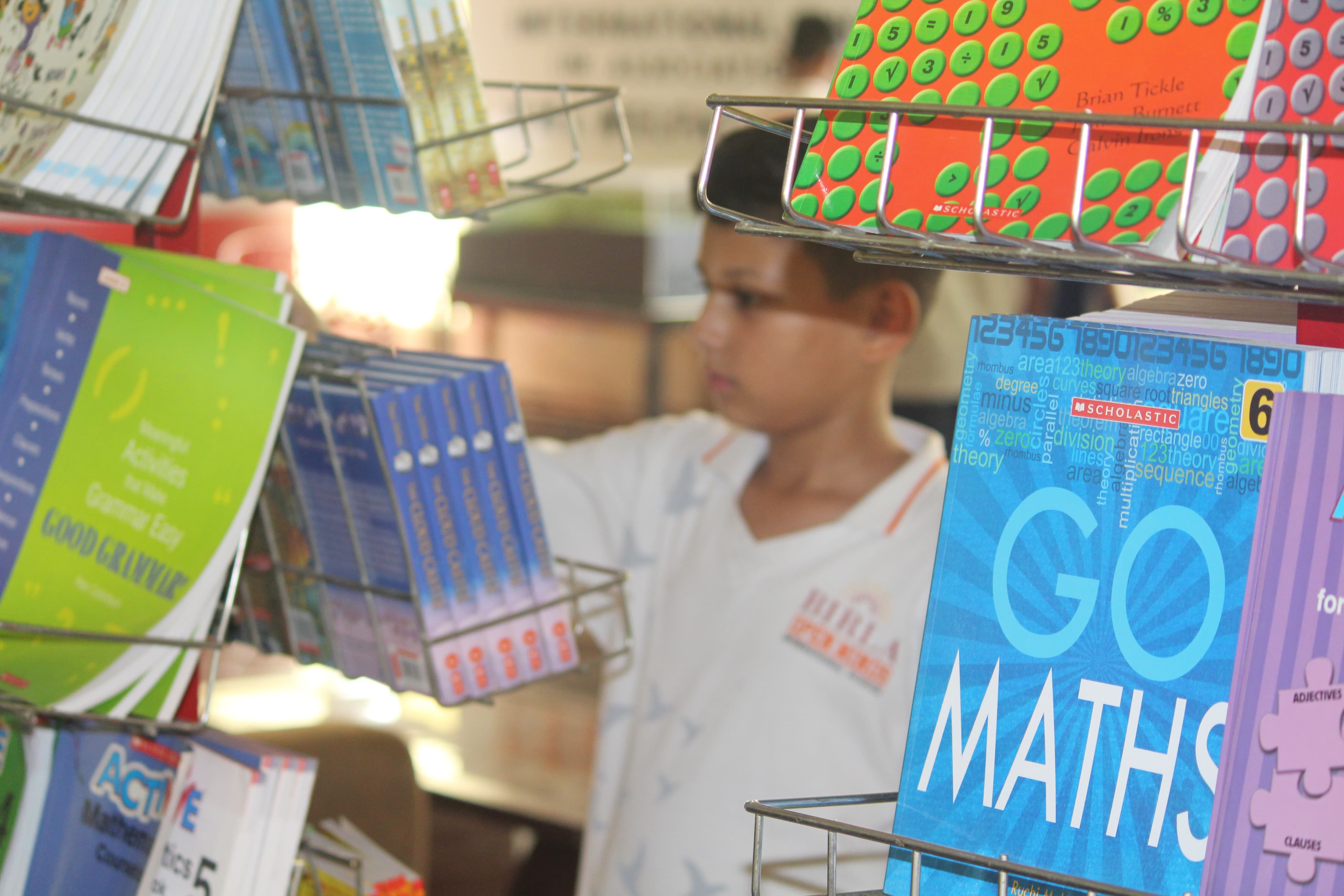 BOMIS students eagerly browsing through a diverse collection of books at the school book fair