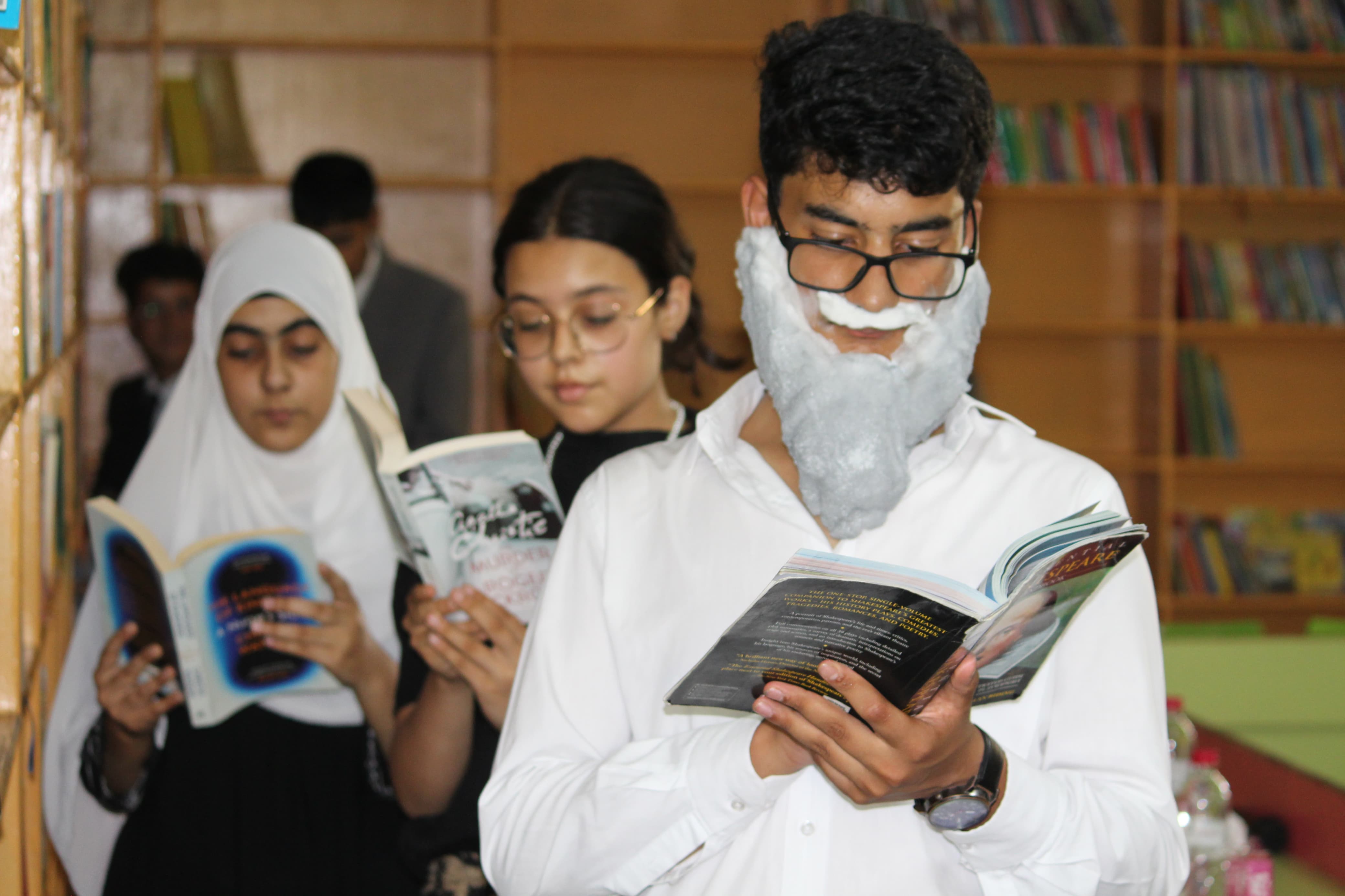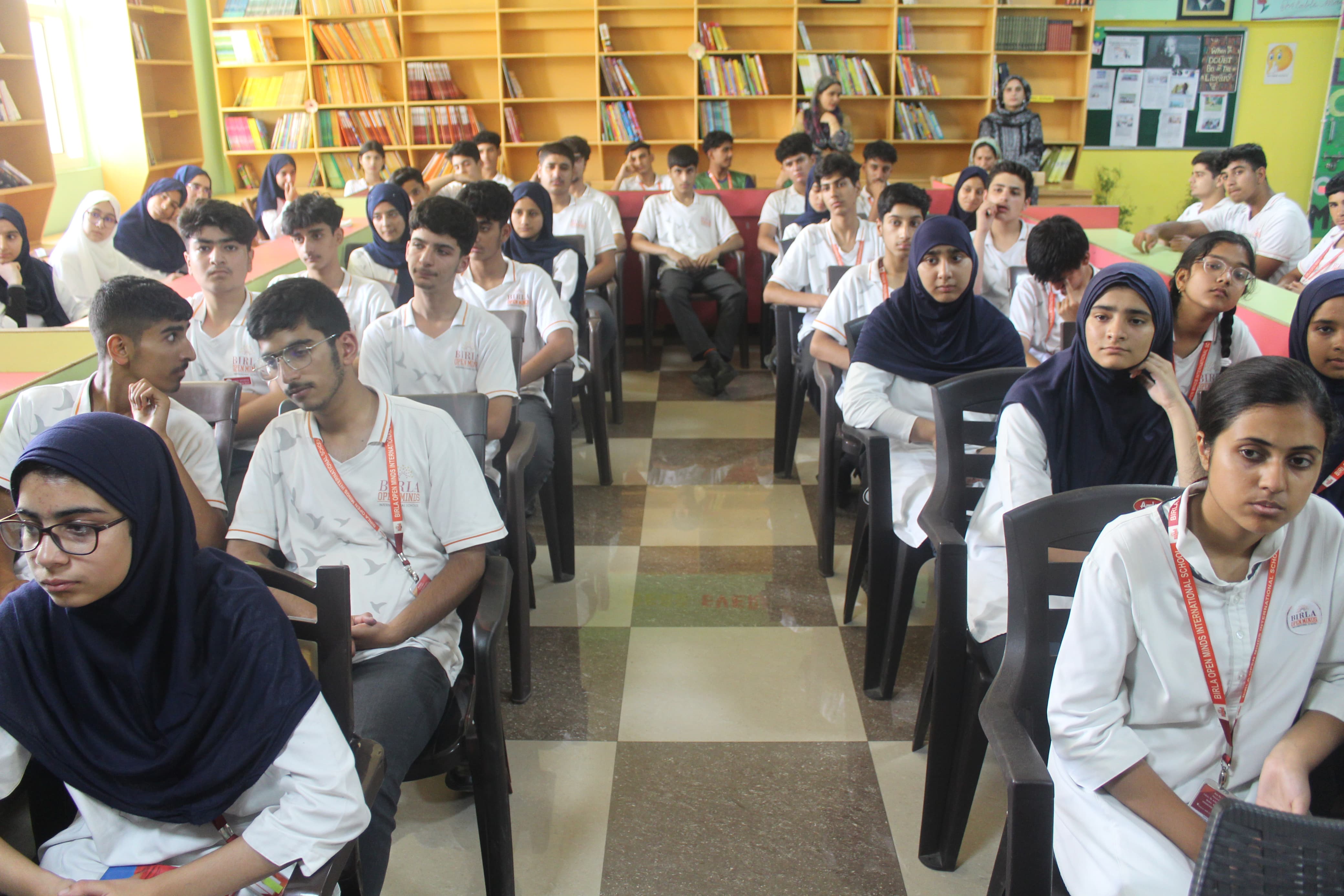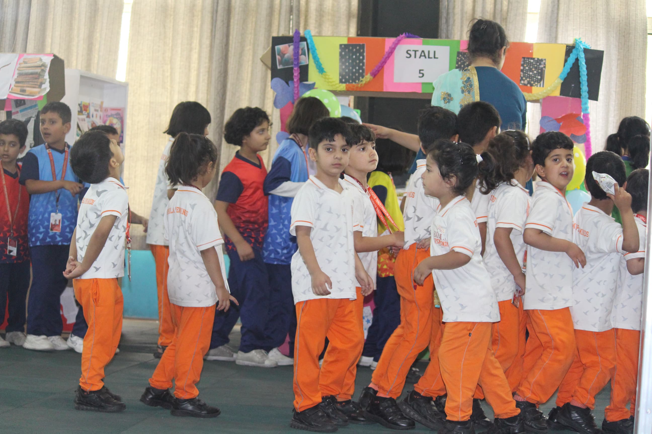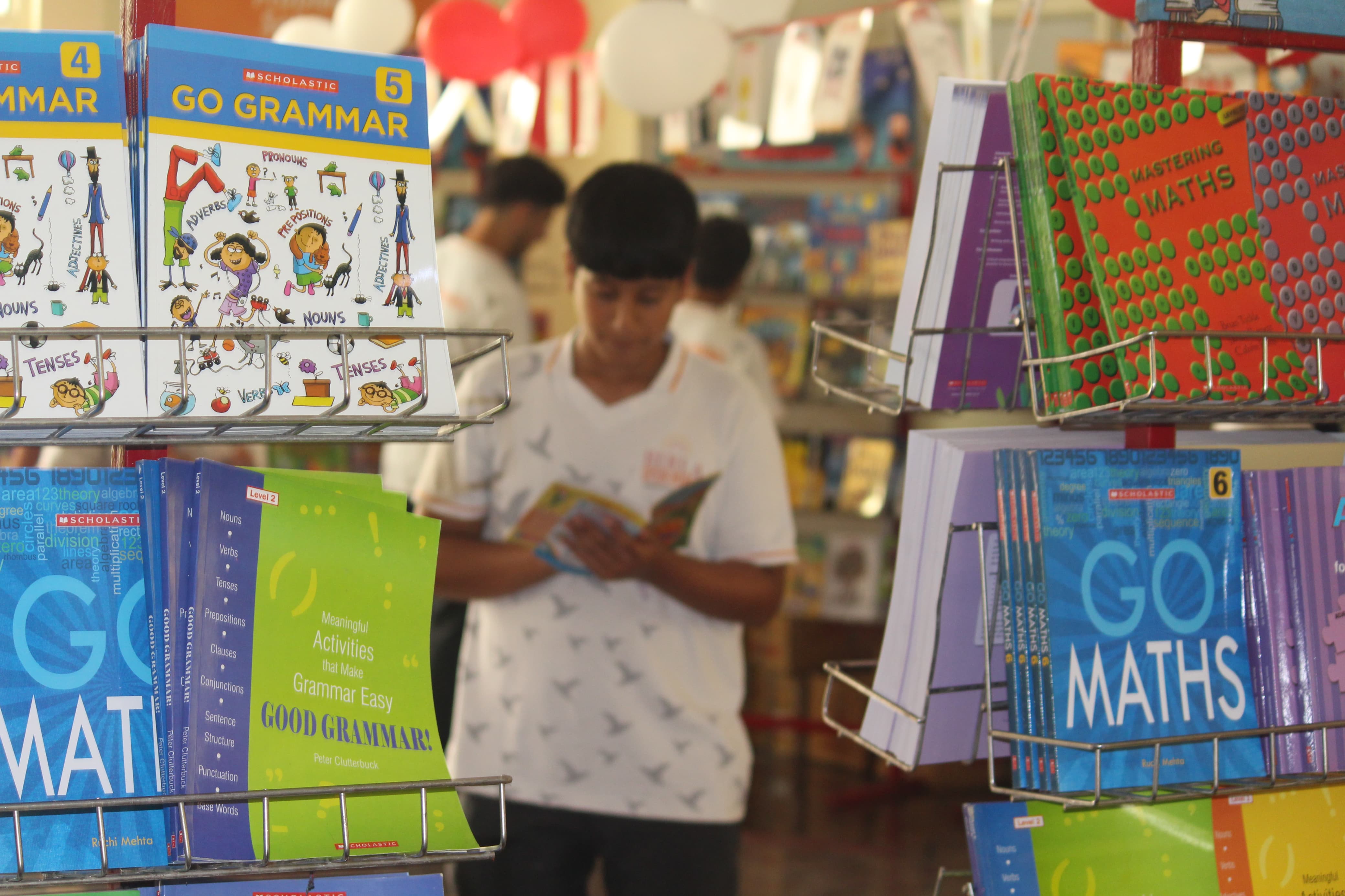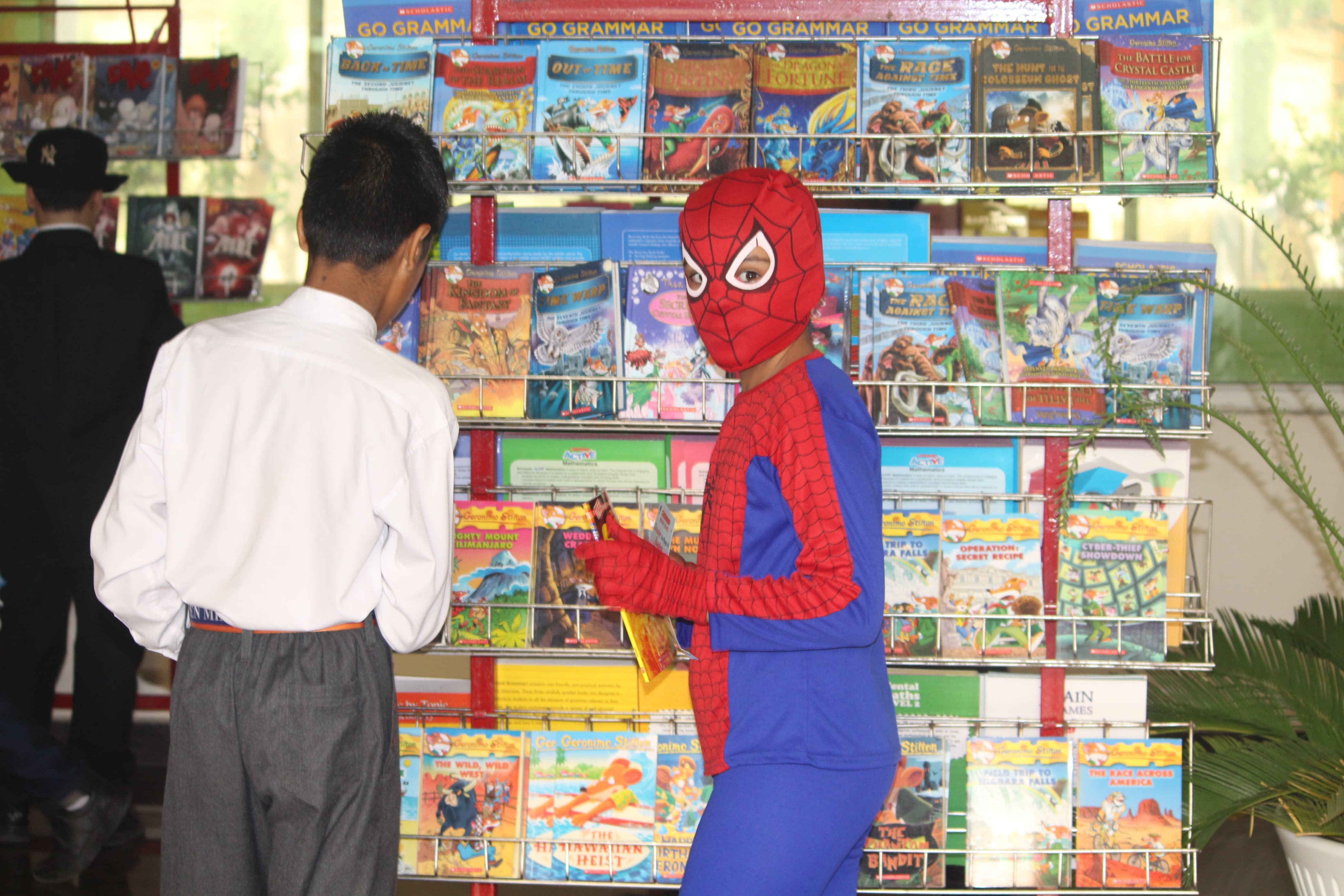BOMIS students eagerly browsing through a diverse collection of books at the school book fair