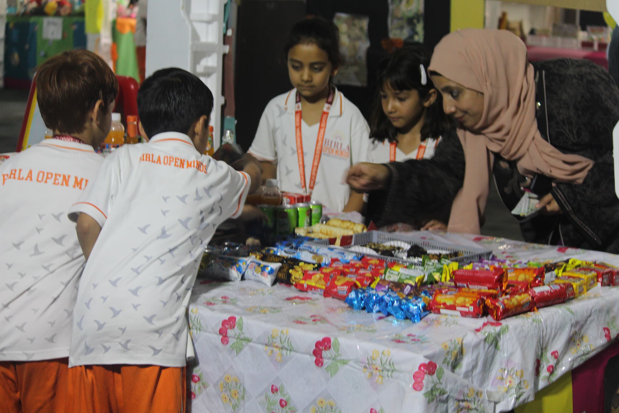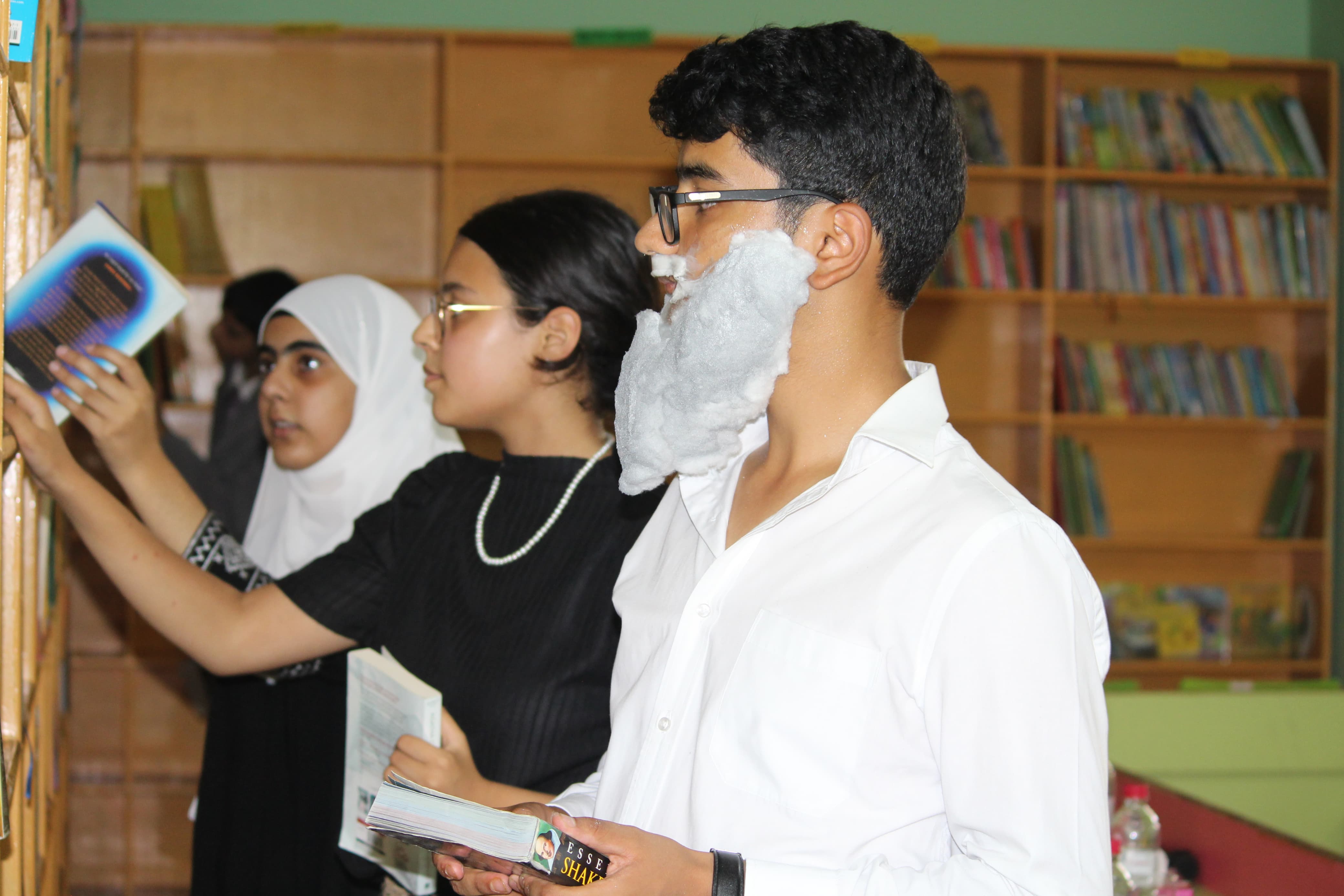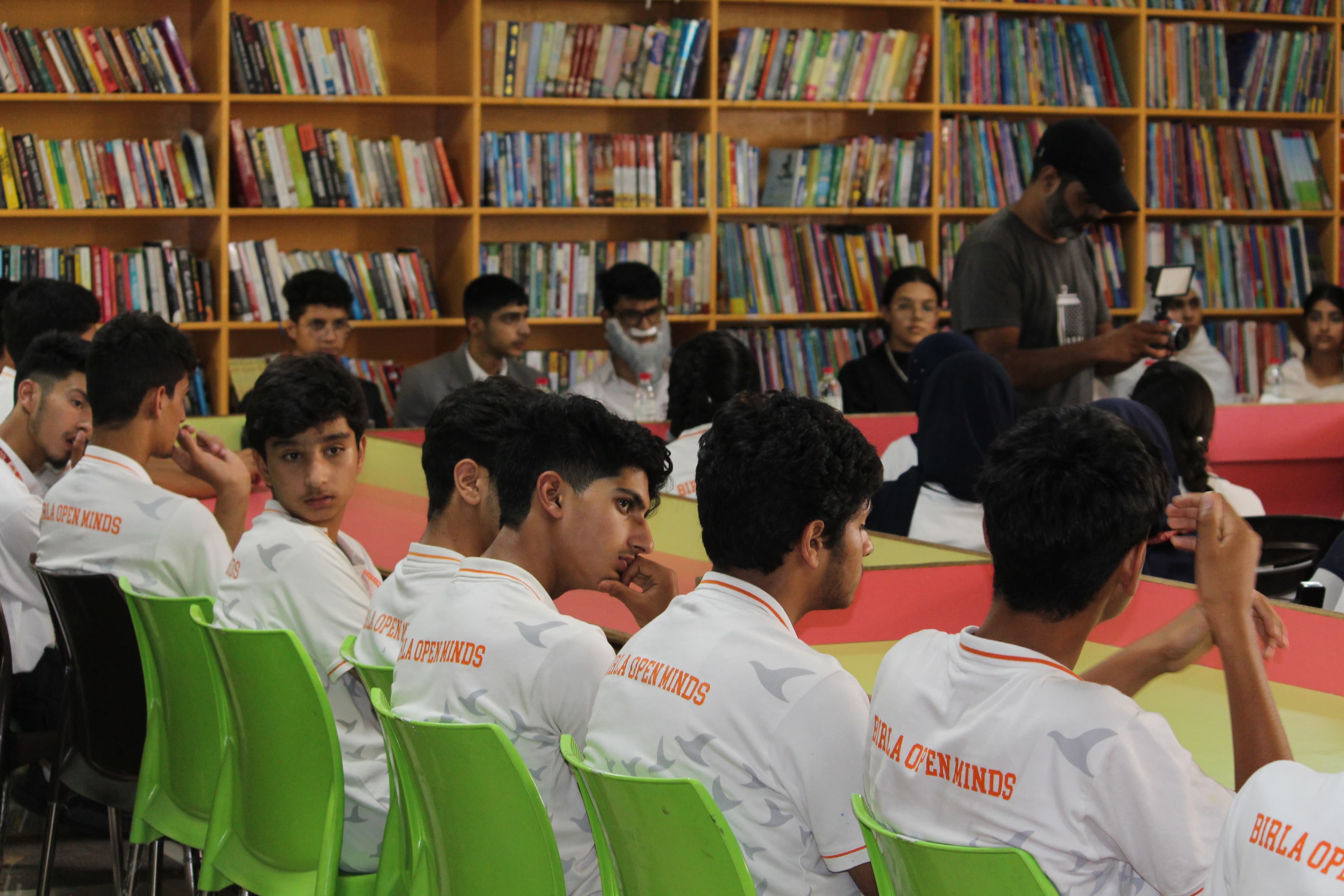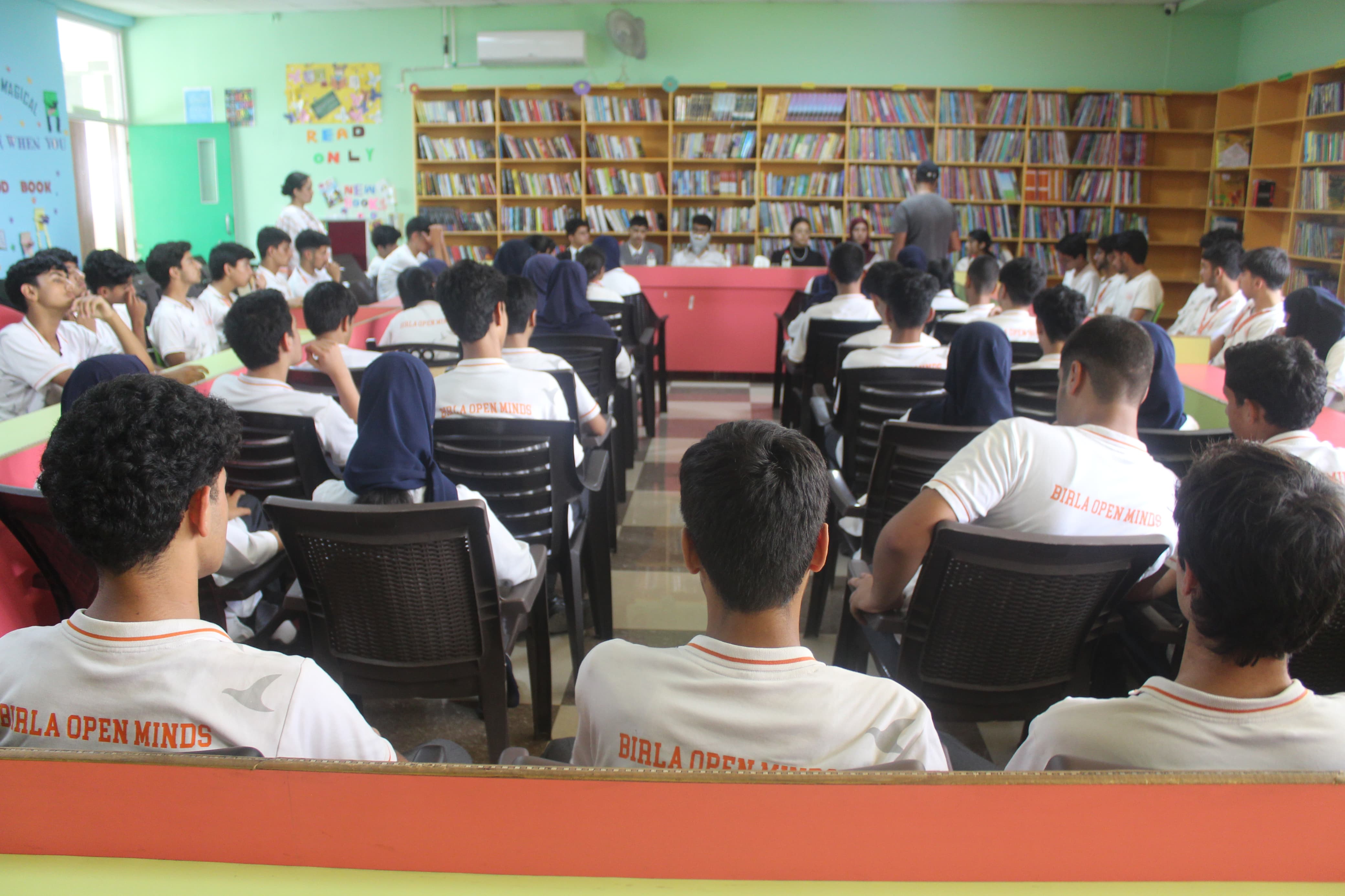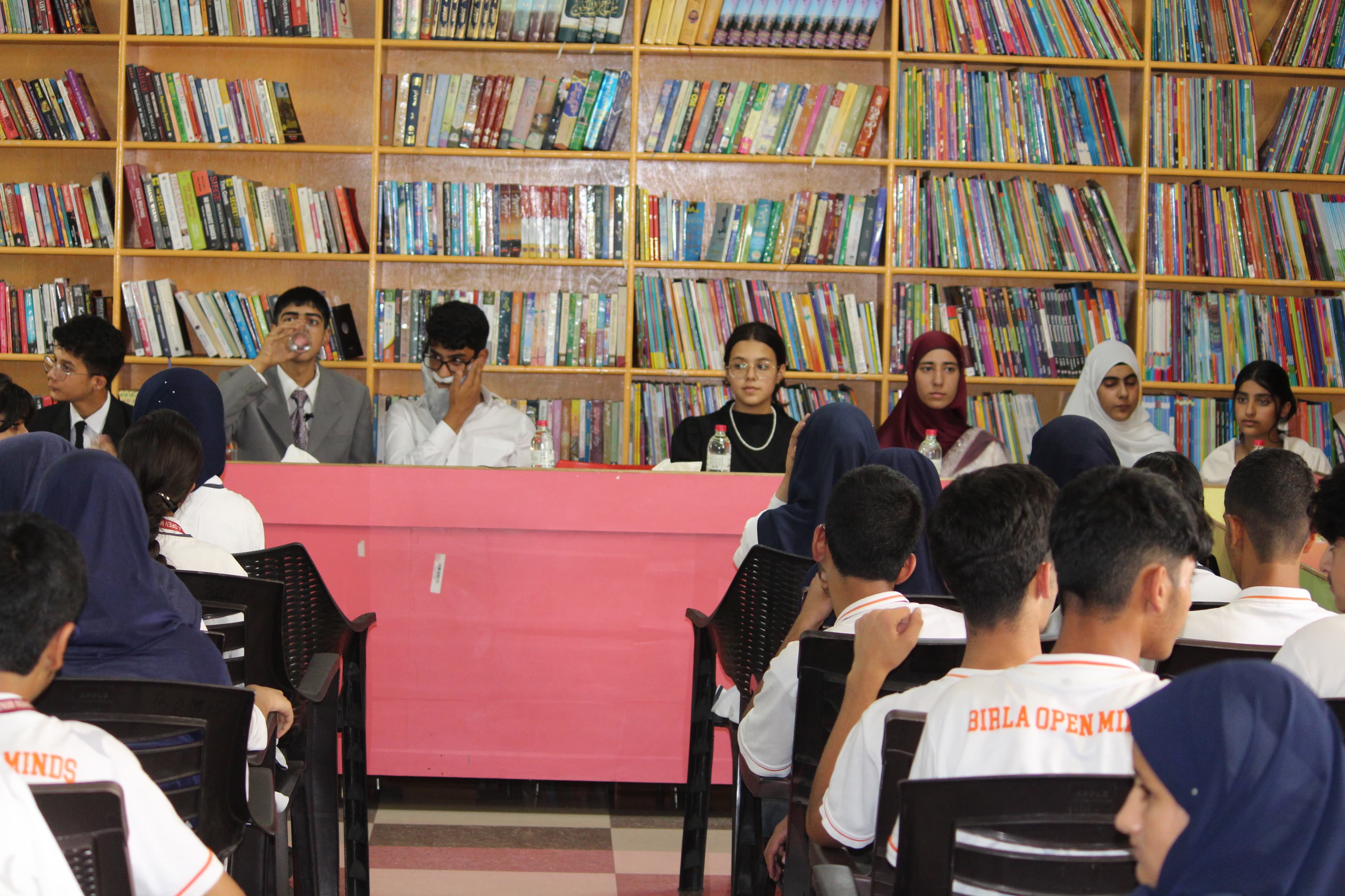 BOMIS students eagerly browsing through a diverse collection of books at the school book fair