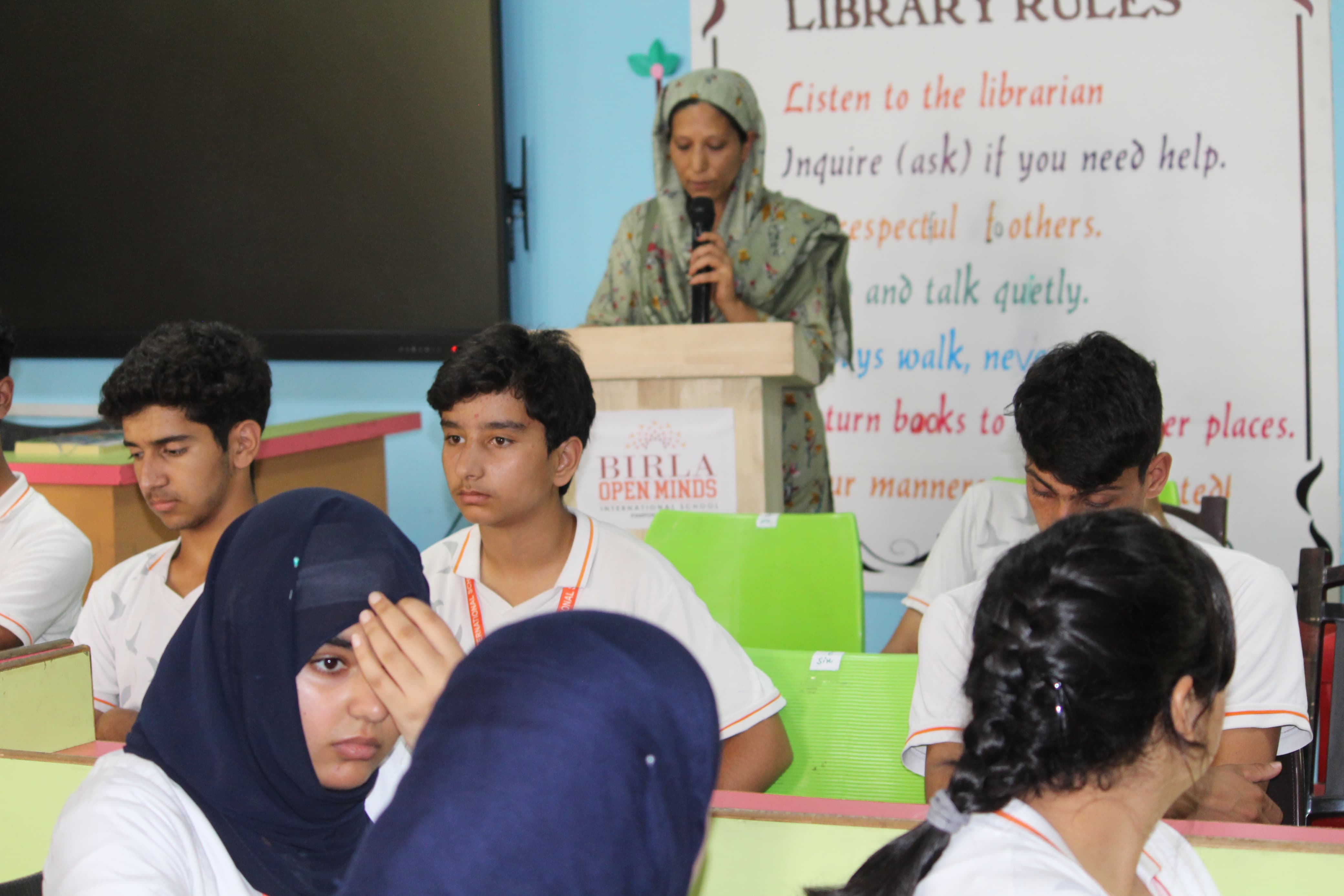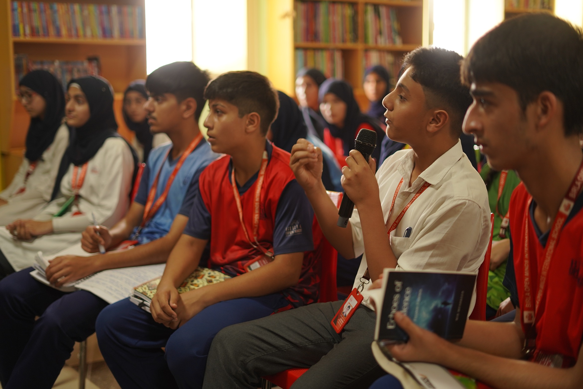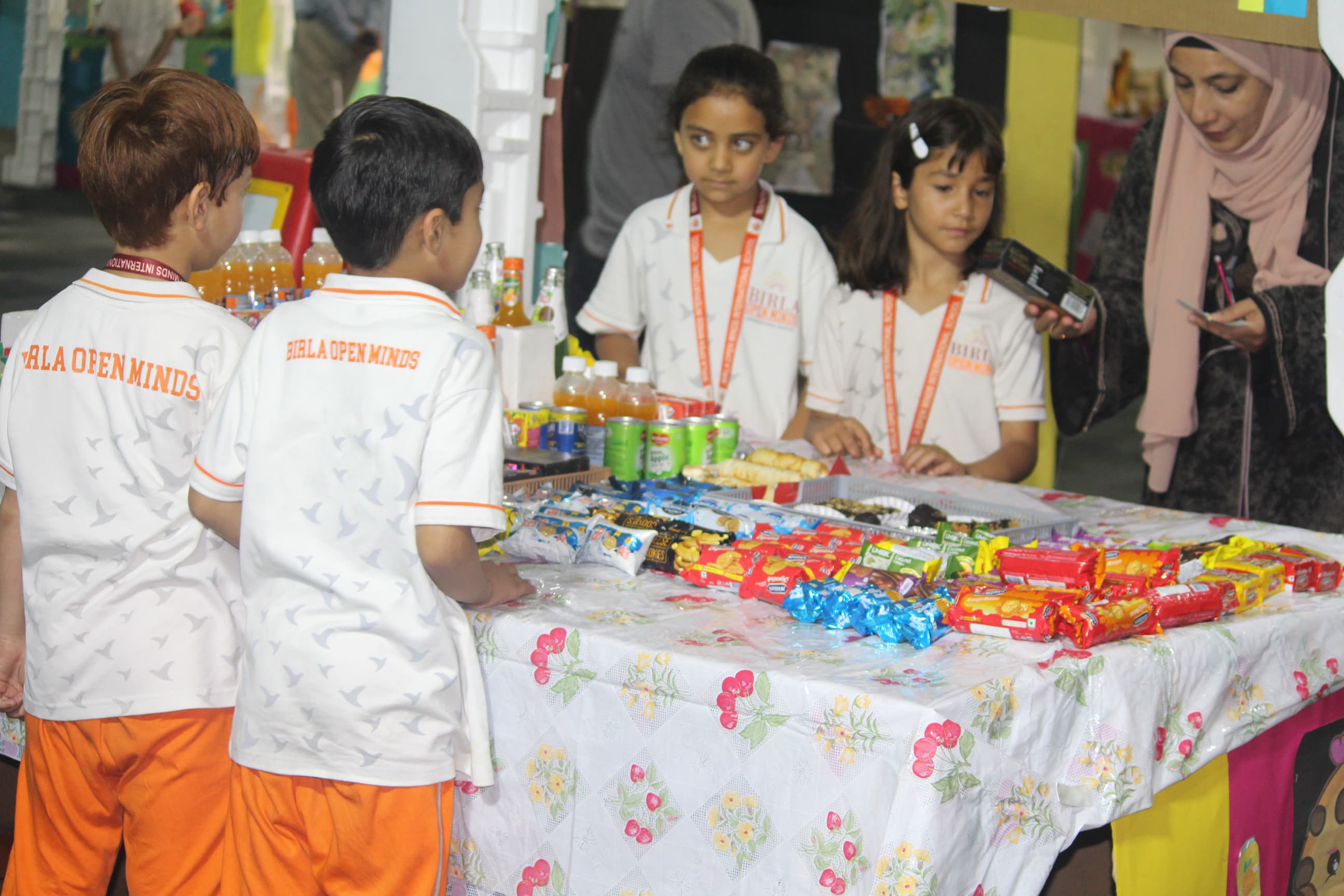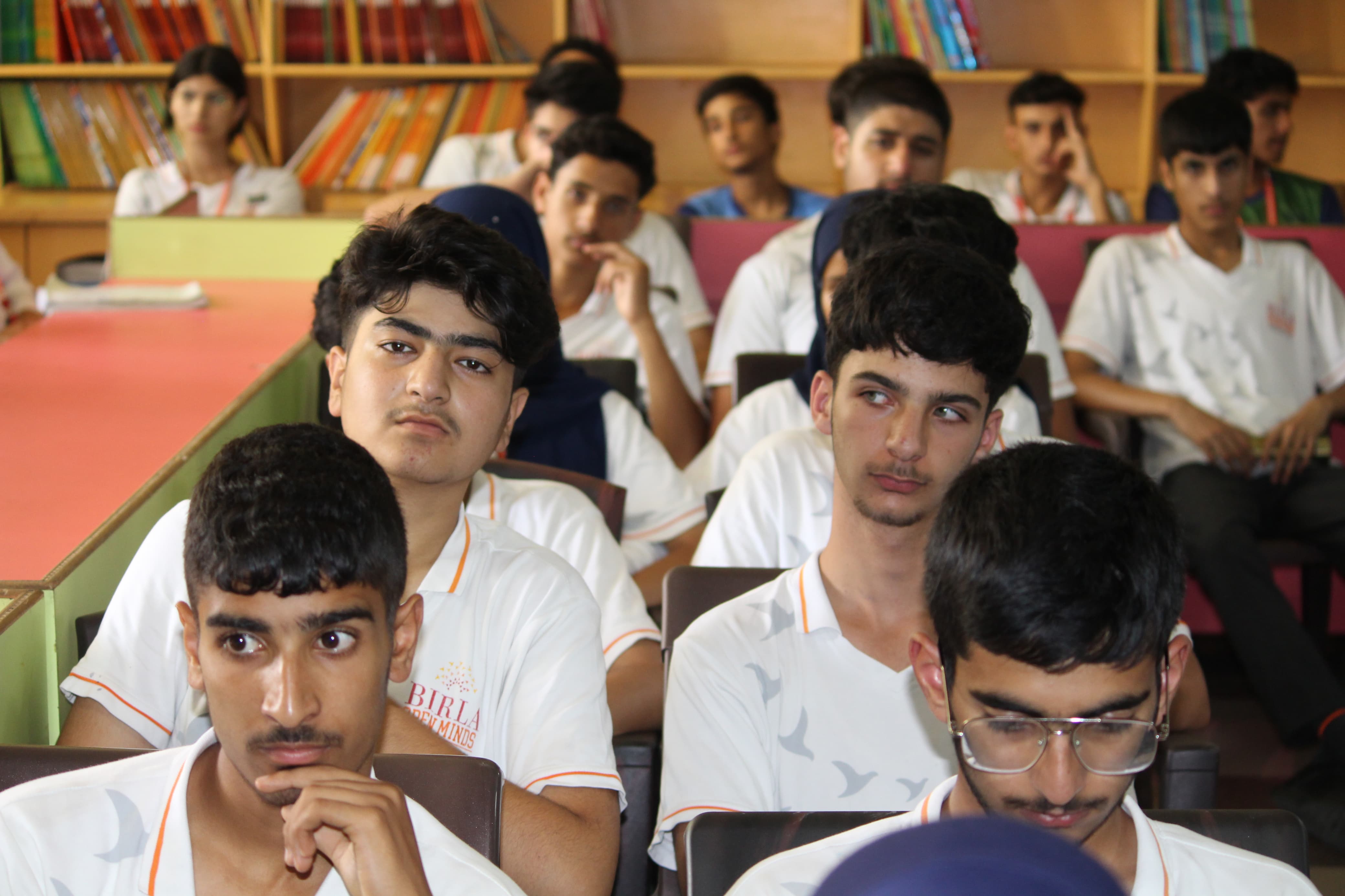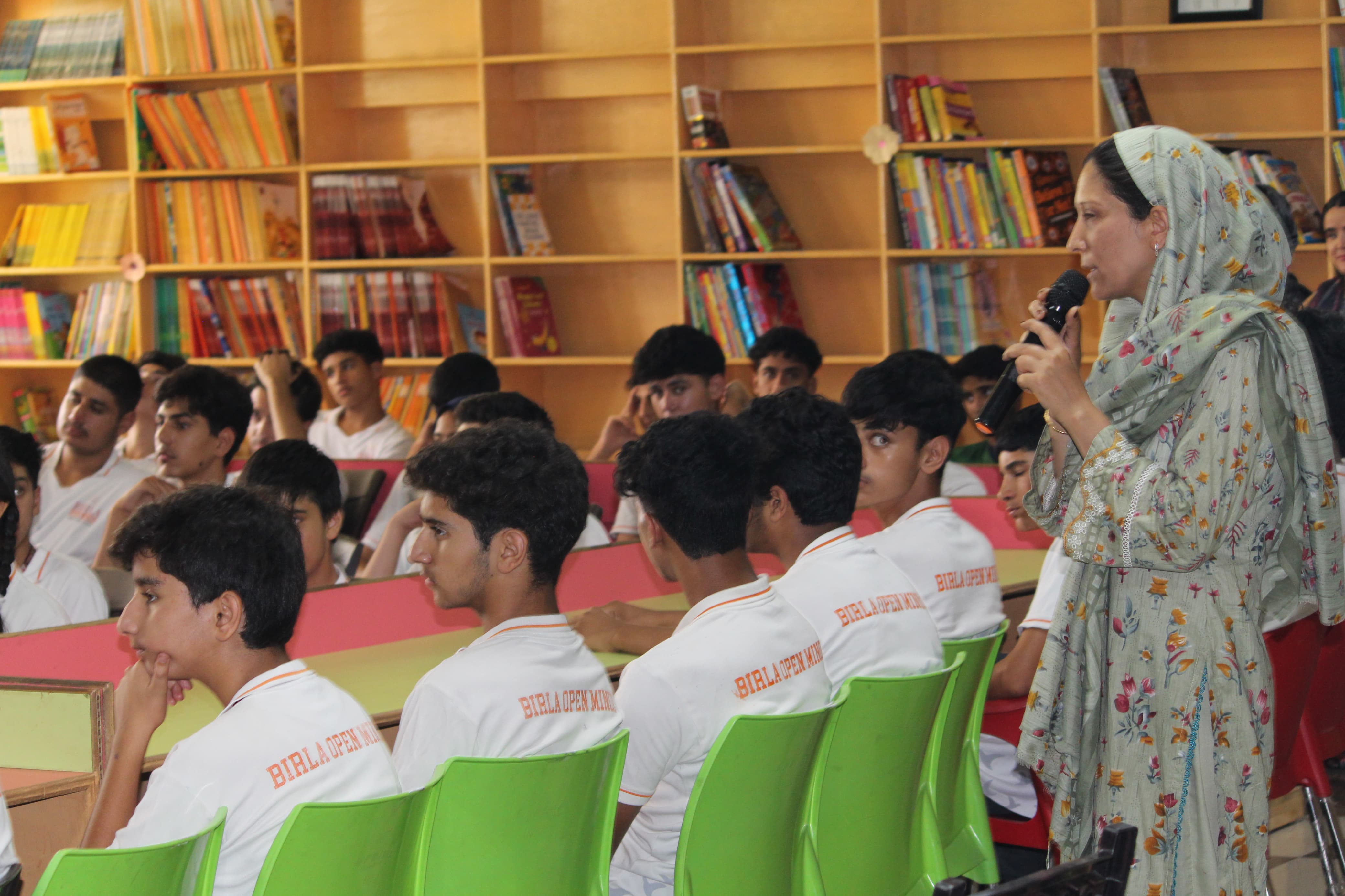 BOMIS students eagerly browsing through a diverse collection of books at the school book fair
